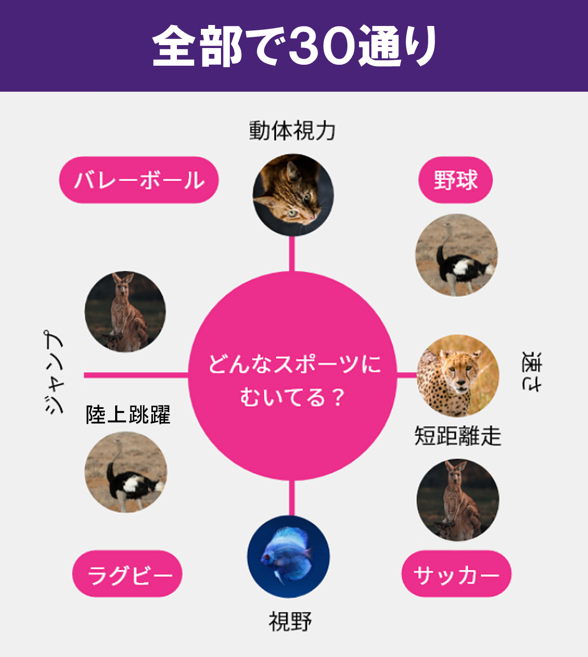 瞬発力と動体視力の結果から、それぞれの結果を掛け合わせて30種類のタイプを診断します。