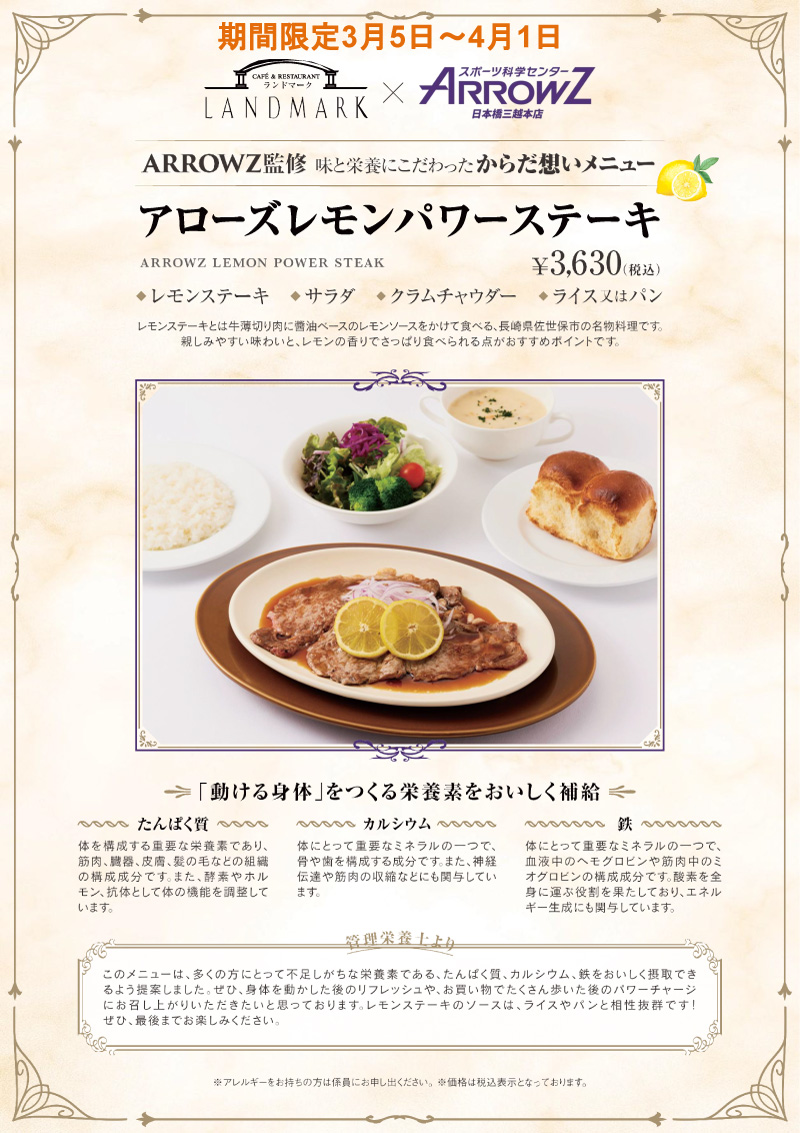 日本橋三越本店新館5階に位置する<カフェ&レストラン ランドマーク>と、隣接する<アローズラボ&アローズジム>がコラボレーションし、健康とパフォーマンス向上をテーマにした特別メニュー「アローズレモンパワーステーキ」を開発しました。